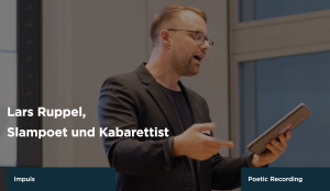 Donnerstag, März 19th, 2026Bei der Recherche nach Bildmaterial stiess ich auf einen Auftrag aus dem Jahr 2023 von der Commerzbank Stiftung. Es gibt kein Video von dem Auftritt, wohl aber wurden die Texte in Schriftform veröffentlicht. Als ich sie las, wurde mir klar, wie fixiert ich mittlerweile auf bewegte Bilder bin. Die Texte, die beim Poetic Recording entstehen, funktionieren auch gelesen und das zeigt mir, dass ich beim Schreiben dieser Texte meinen Anspruch an Form und Stil wahre. Während meiner Zeiten auf Slam Bühnen war mir das immer wichtig, dass ich sowohl “Page”- als auch “Stage”- Poetry mache.